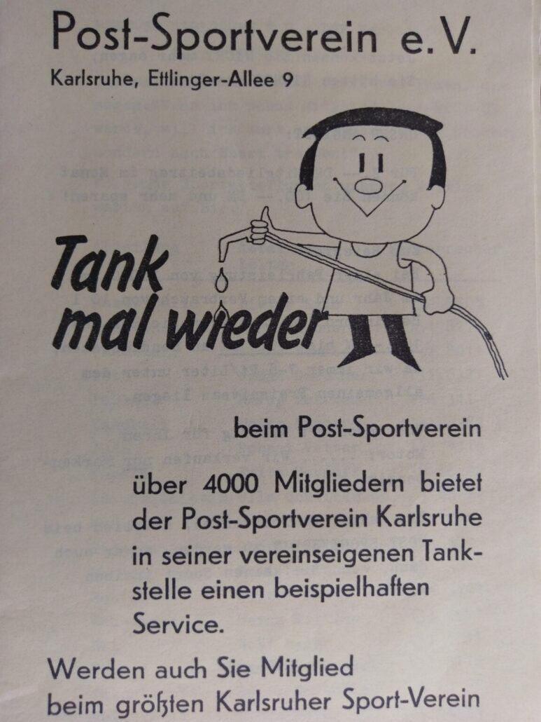Nicht, dass es im Verein übermäßig viele Rennfahrer*innen und Motorsportbegeisterte gegeben hätte – es handelte sich vielmehr um eine geschickte Maßnahme der Mitgliedergewinnung und -bindung. Denn für anfangs 1 DM Abteilungsbeitrag (Quelle nicht belegt) erwarben die Mitglieder der Motorsportabteilung das Recht, sich an der vereinseigenen Tankstelle zu vergünstigten Konditionen mit Kraftstoff zu versorgen.