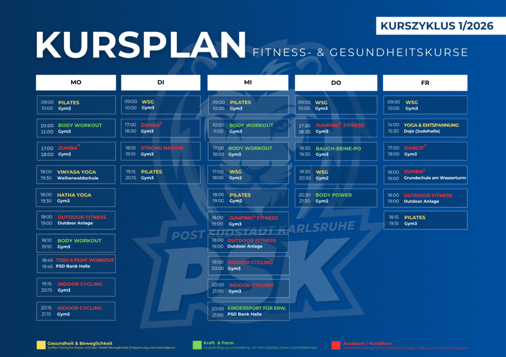 Alle Kurse werden von lizenzierten und erfahrenen Übungsleitern durchgeführt, die Sie kompetent und mit viel Engagement begleiten. Die Kurszyklen starten im Januar, April und September. Zwischen den Hauptkurszyklen gibt es zudem zusätzliche „Specials“ und „Exclusive Specials“ , die von unseren Trainern angeboten werden – perfekte Gelegenheiten, Ihr Training abwechslungsreich zu gestalten.