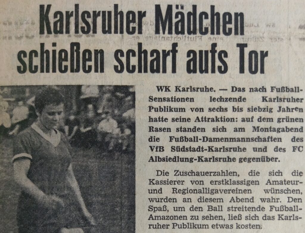 Dies belegt ein Zeitungsartikel aus den BNN vom 12. Juni 1966, der von einer Begegnung zwischen den Teams des VfB Südstadt und des FC Albsiedlung berichtet. Die VfB-Damen gewannen die Partie mit 13:0!
